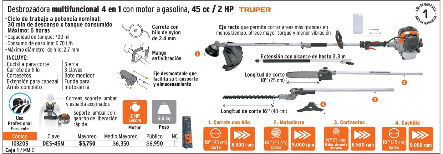 Desbrozadora multifuncional y cortasetos con motor a gasolina